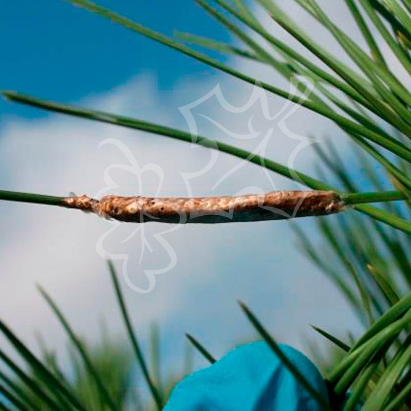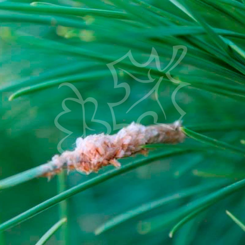 En los primeros estadios larvarios la alimentación es fundamental. Aquí se observa una larva alimentándose de la acícula (hoja) de un pino.