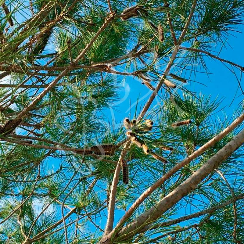Aquí observamos una colonia completa de larvas de procesionaria alimentándose de las acículas de un pino.